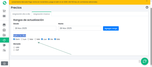 5. En la sección Aplica los días, Se deja marcado los días que aplicara la tarifa y se destila los demás días